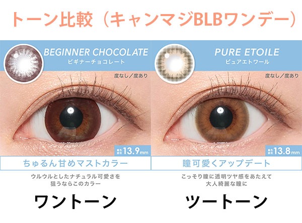 黒目・茶目が大半ということで、カラコンを着けている感じを出したくない人は黒目ならブラック系またはダークブラウン系、茶目ならブラウン系のカラコンを選ぶのがいいかと思います。その中でワントーンカラーなのか、ツートーンカラー(2色を混ぜた色味)でまた選ぶと自分好みのカラコンを選べると思います。(キャンディーマジックBLBワンデー参照)